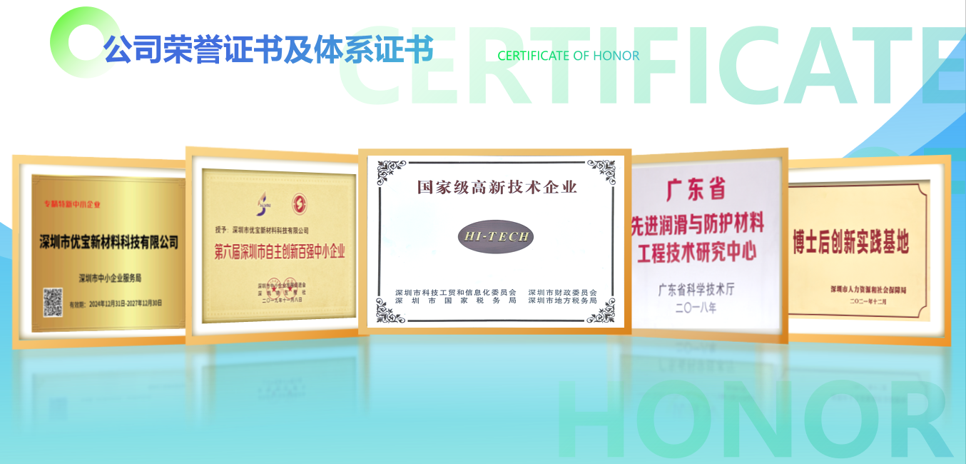 持續(xù)創(chuàng)新使優(yōu)寶新材擁有多項自主知識產(chǎn)權(quán),榮獲國家級高新技術(shù)企業(yè),中國中小企業(yè)創(chuàng)新100強、深圳自主創(chuàng)新百強企業(yè),技術(shù)成果廣泛應(yīng)用于多行業(yè)。